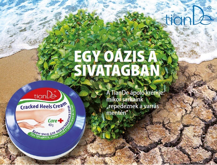 A TianDe ápoló krémje a kirepedezett sarkakra segít megbirkózni e következményekkel és megvédi a bőrt az „elsivatagosodástól”. A krém összetétele értékes növényi kivonatokat és olajokat, valamint vitaminokat és hidratáló hatású összetevőket tartalmaz.