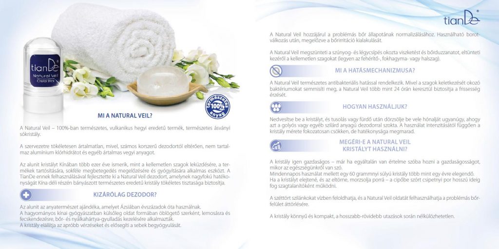 Az alunit kristályt Kínában több ezer éve ismerik, mint a kellemetlen szagok leküzdésére, a termékek tartósítására, sokféle megbetegedés megelőzésére és gyógyítására alkalmas eszközt. A TianDe ennek felhasználásával fejlesztette ki a Natural Veil dezodort, amelynek nagyfokú hatékonyságát Kína déli részén bányászott természetes eredetű kristály tökéletes tisztasága biztosítja.
