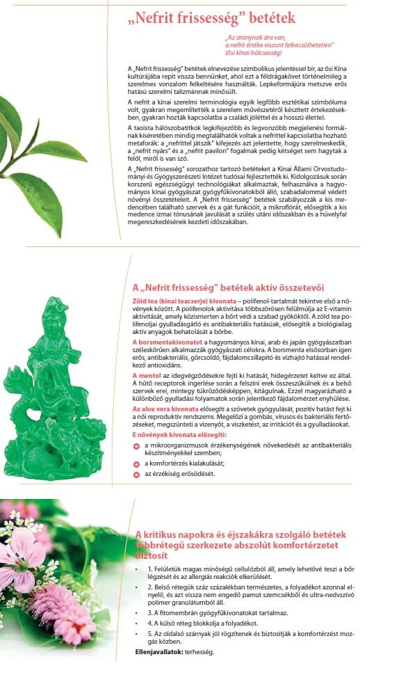 A „Nefrit frissesség” betétek szabályozzák az intim területek mikroflóráját, a kismedencében található szervek és a gát funkcióit, elősegítik a kismedencei izmok tónusának javulását a szülés utáni időszakban és a hüvelyfal megereszkedésének kezdeti időszakában.