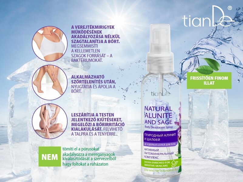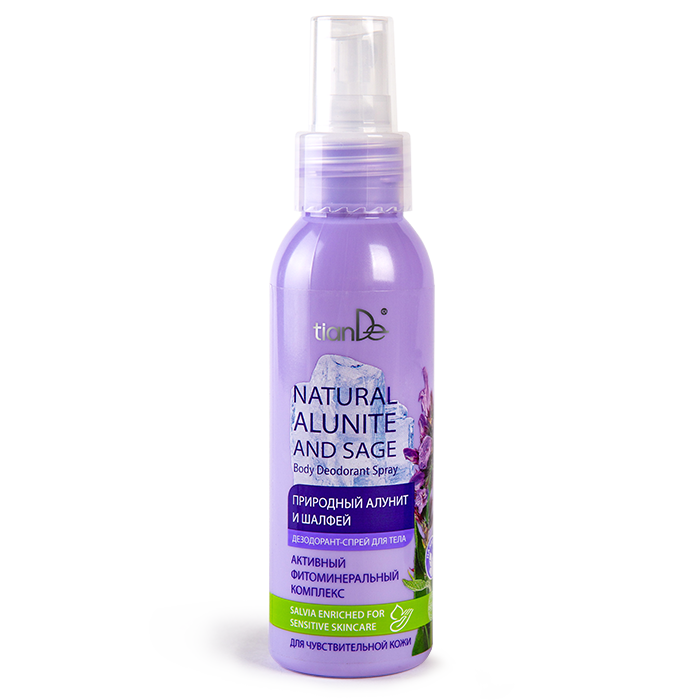 A „Természetes alunit és zsálya” testdezodor spray – többfunkciós testspray, amely nem tömíti el a pórusokat, nem akadályozza a méreganyagok kiválasztódását a szervezetből. Használata után a bőr komfortos érzetet nyújt. A dezodorspray nem hagy foltokat a ruházaton.