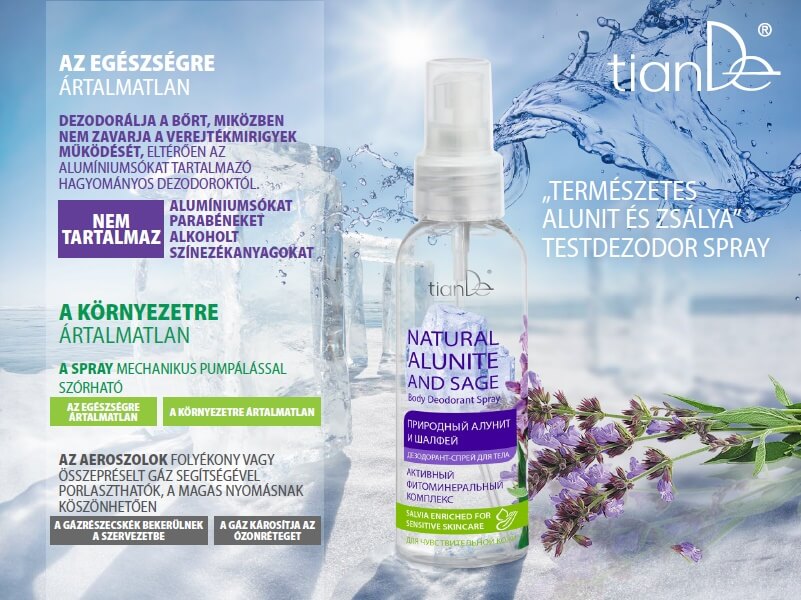 A „Természetes alunit és zsálya” testdezodor spray anélkül szagtalanítja a bőrt, hogy megzavarná a verejtékmirigyek működését. Nem tartalmaz alumíniumsókat, alkoholt, parabéneket és színezékanyagokat: nem ártalmas a szervezetre.